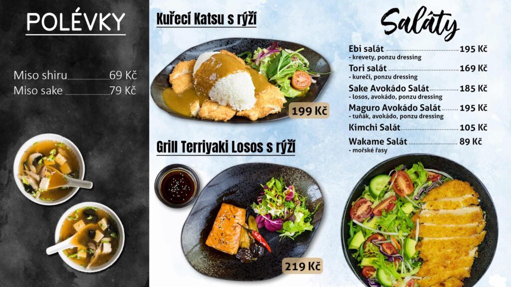 | Sashimi | Tenké plátky syrové ryby nebo mořských plodů bez rýže. | Tuňák, losos, sépie, chobotnice. |